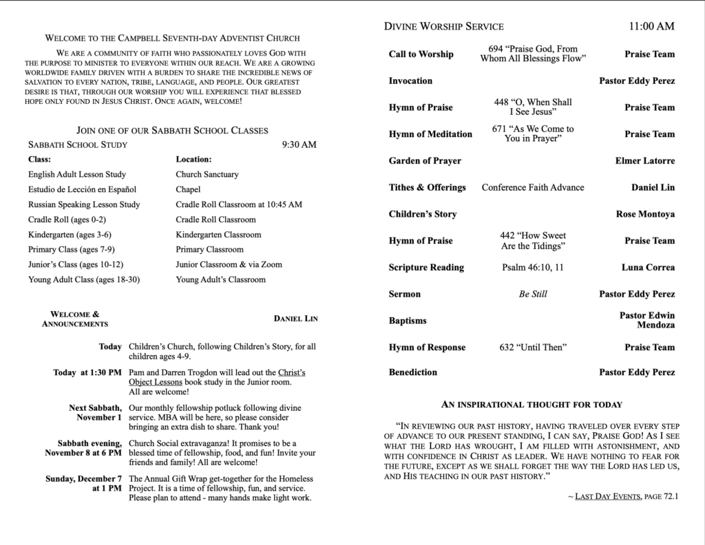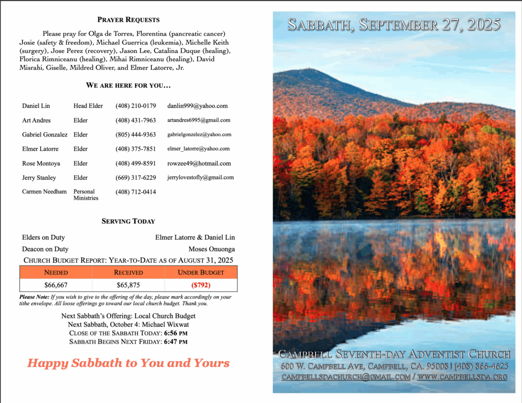 https://campbellsda.org Campbell Seventh Day Adventist Church Sat, 25 Oct 2025 07:21:20 +0000 en-US hourly 1 https://wordpress.org/?v=6.9.1 https://campbellsda.org/wp-content/uploads/2023/07/cropped-logo-32x32.png https://campbellsda.org 32 32 226396231 Church Bulletin 10/25/26 https://campbellsda.org/church-bulletin-10-25-26/ https://campbellsda.org/church-bulletin-10-25-26/#respond Sat, 25 Oct 2025 07:21:19 +0000 https://campbellsda.org/?p=3065